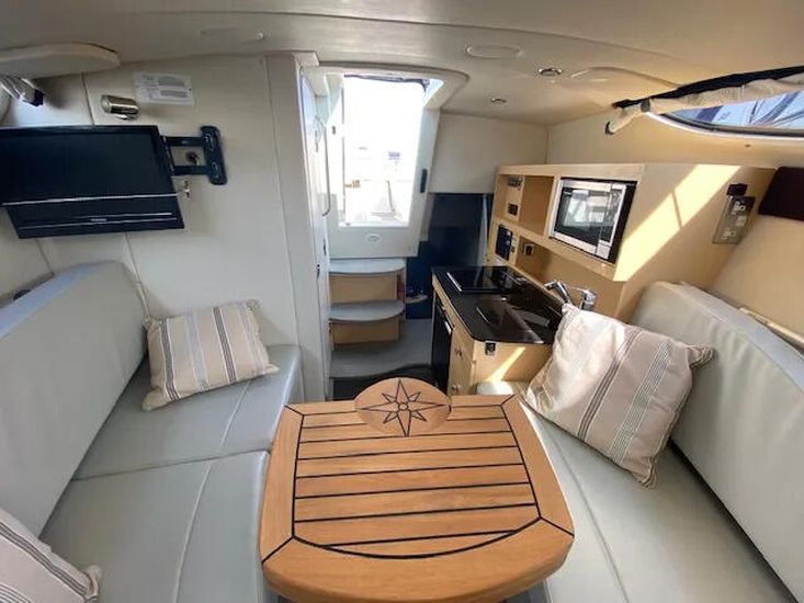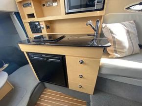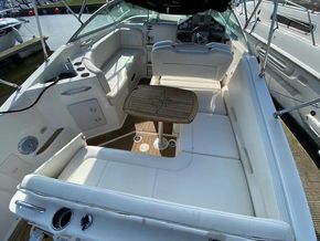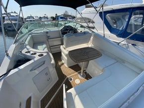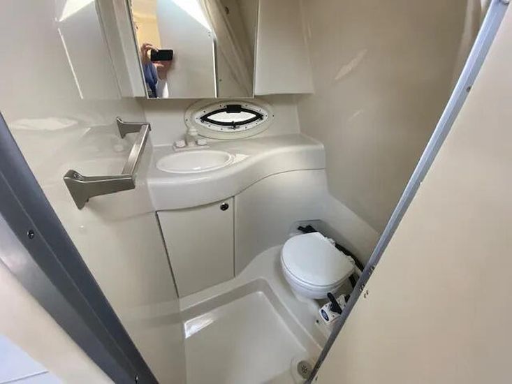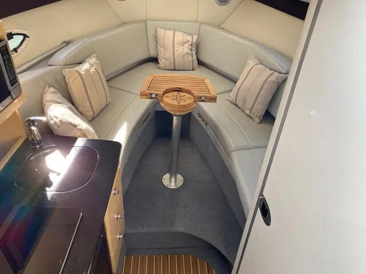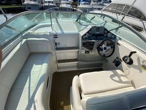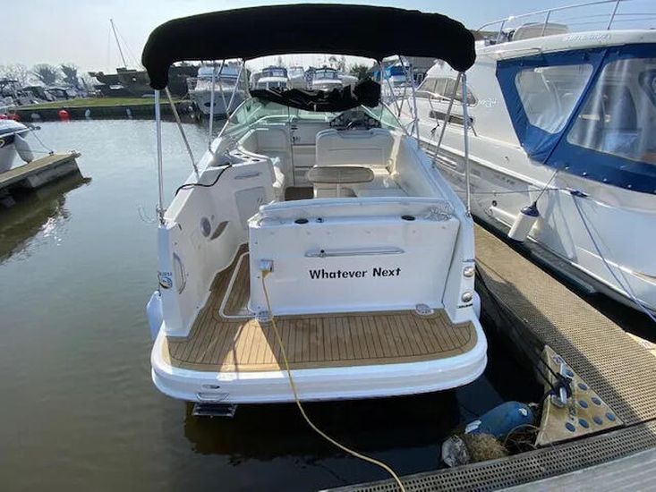 Well presented example of the well know American style sports cruiser. The Bayliner 255 is fitted with a single Mercruiser V8 5.0 liter 260hp petrol engine on a stern drive. She has a good layout from the spacious social cockpit area with a reversing helm seat and accommodation for 4 berths with a master front cabin. She has a galley area of an alcohol stove with a 12 volt domestic fridge and sink. She has a manual flush toilet with a pull out shower. She is a tidy boat located at our Brundall Marina.