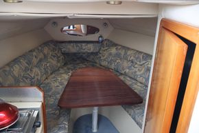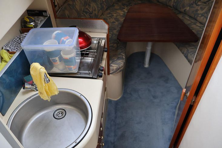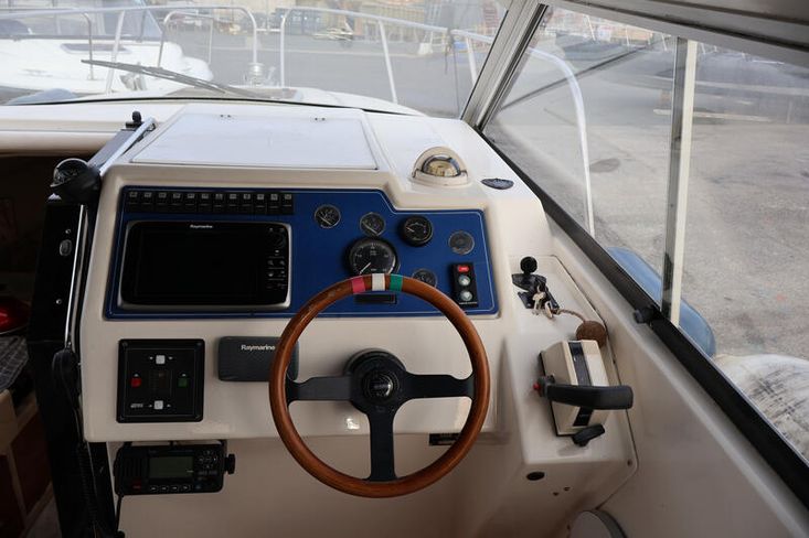 Compact yet cleverly designed, with a convertible cockpit seating area, double berth, galley, and toilet facilities. Recent maintenance includes a new turbo, supercharger clutch, and drive service (2024–25), plus updated Raymarine electronics.