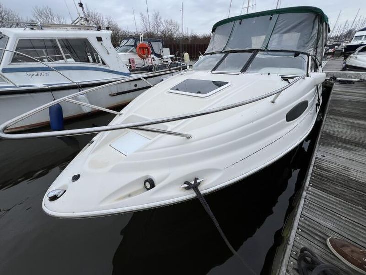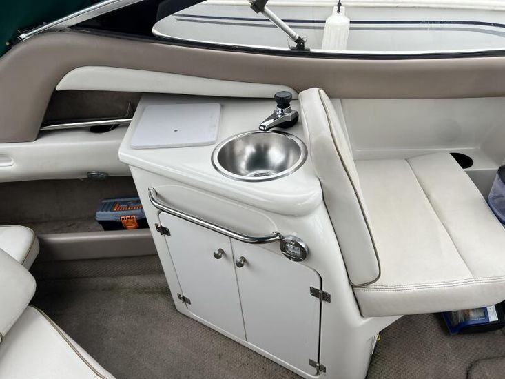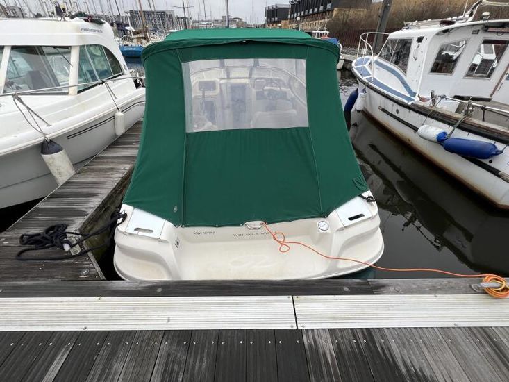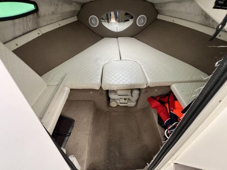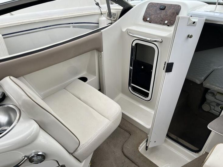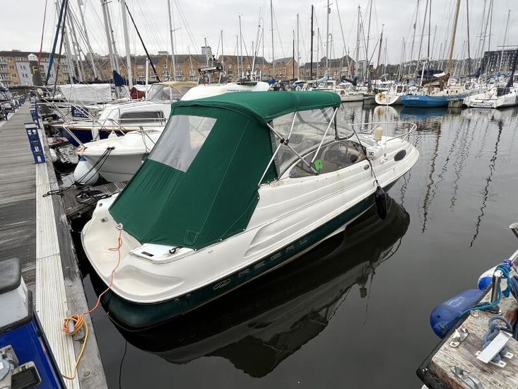 The Regal 2150 has a large, comfortable cuddy cabin for overnighting. The cockpit has a sundeck with bench seat and forward facing helm seats. The cockpit features a wetbar with a sink, removable cooler, and optional portable stove. The 2150 cabin features a spacious V-berth, a concealed porta loo, an opening companionway hatch, and a locking door. An oval porthole and foredeck hatch add light and ventilation to the cabin.