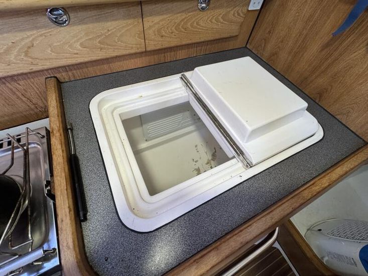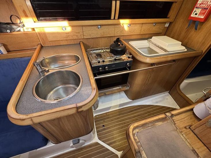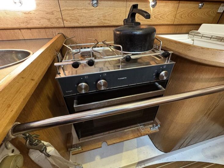The galley is equipped with modern appliances, allowing for easy meal preparation while cruising - Large top loading fridge, Dometic 2 burner gas oven (gas system overhauled in 2023 with current gas safety cert), 1.5 bowl osculati sink and hot/cold water tap and Numerous storage cupboards