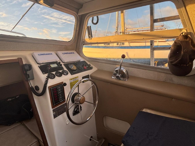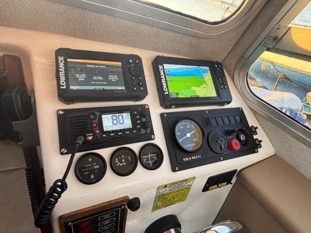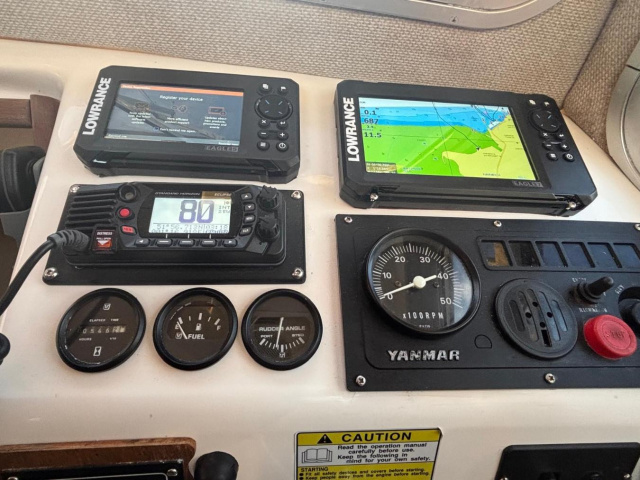 Compass, Raymarine C80 chart plotter and radar, Standard Horizon DSC VHF radio, Lowrance Eagle 7 plotter, Lowrance Eagle 5 fish finder, navigation lights, steaming light, anchor light.