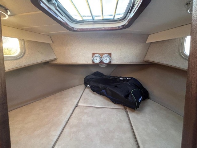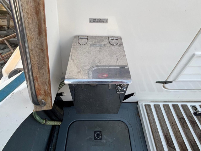 Stainless steel pulpit, cockpit cover, grey cockpit cushions, stainless steel gas locker, boarding ladder, wheel steering, 7.5kg Bruce anchor with 100m of multiplait and 6m of 10mm chain, Lewmar electric anchor windlass (overhauled and rewired 2025), various mooring warps and fenders.
